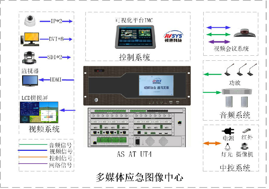 应急中心采用视通科技自主研发的高度集成综合一体化主机AS-UT4,具备视频矩阵和拼接管理、安防监控管理、音频管理、录制及回放管理、中控外部设备管理、外围视频会议终端和主机自带视频会议双备份管理、可视化综合管理平台管理等功能。项目实现应急中心应急指挥保障、上下级单位视频会议的统一调度与管理。