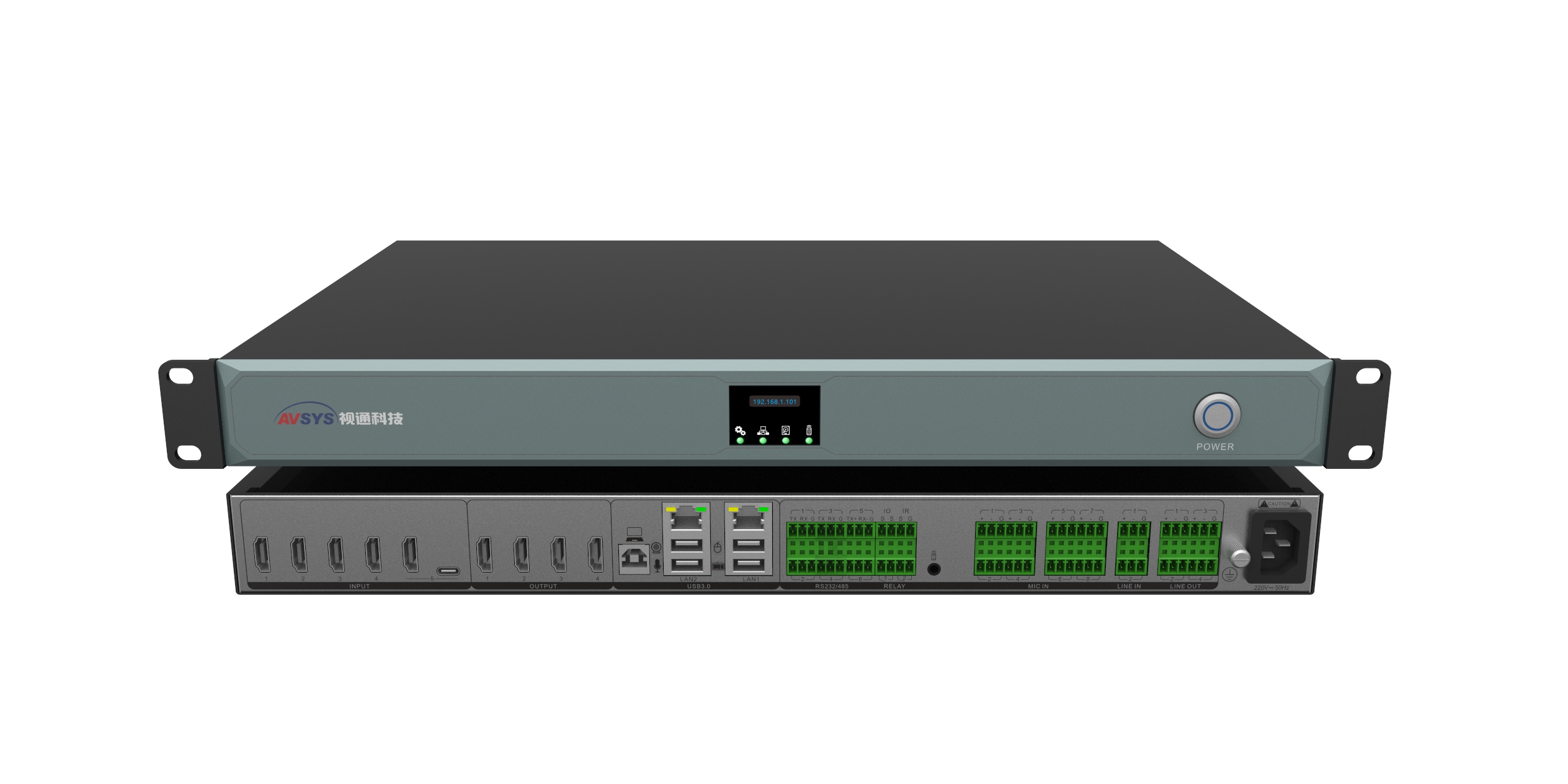 1. 高度集成:主机以ALL-IN-ONE的设计理念,集AVCRTM六合一:将音频处理器A、视频无缝混矩V、可编程中控C、录播编解码R、视频会议终端T、多方互动MCU综合于一体。